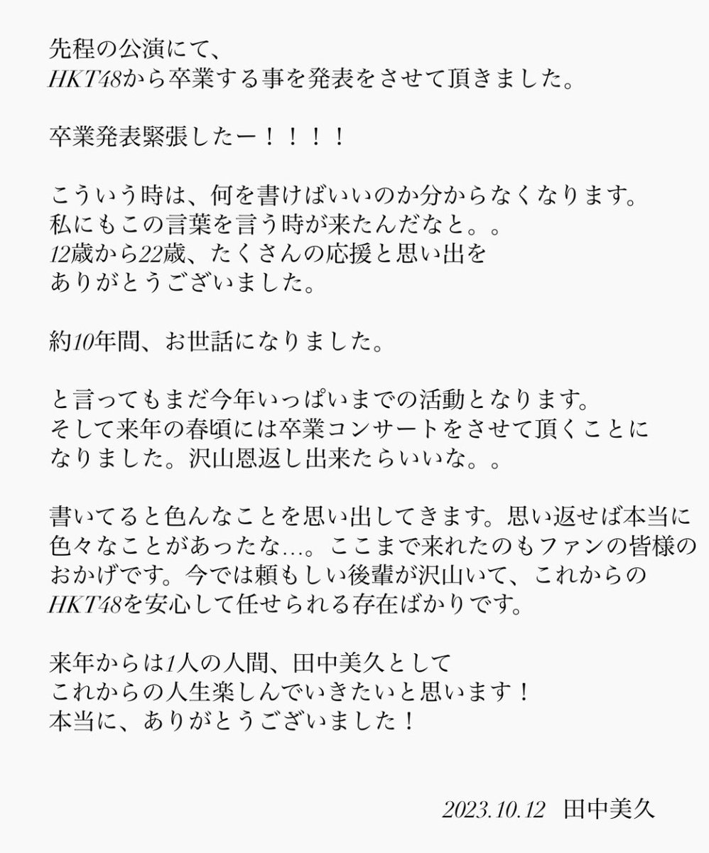 私、田中美久はHKT48を卒業します。