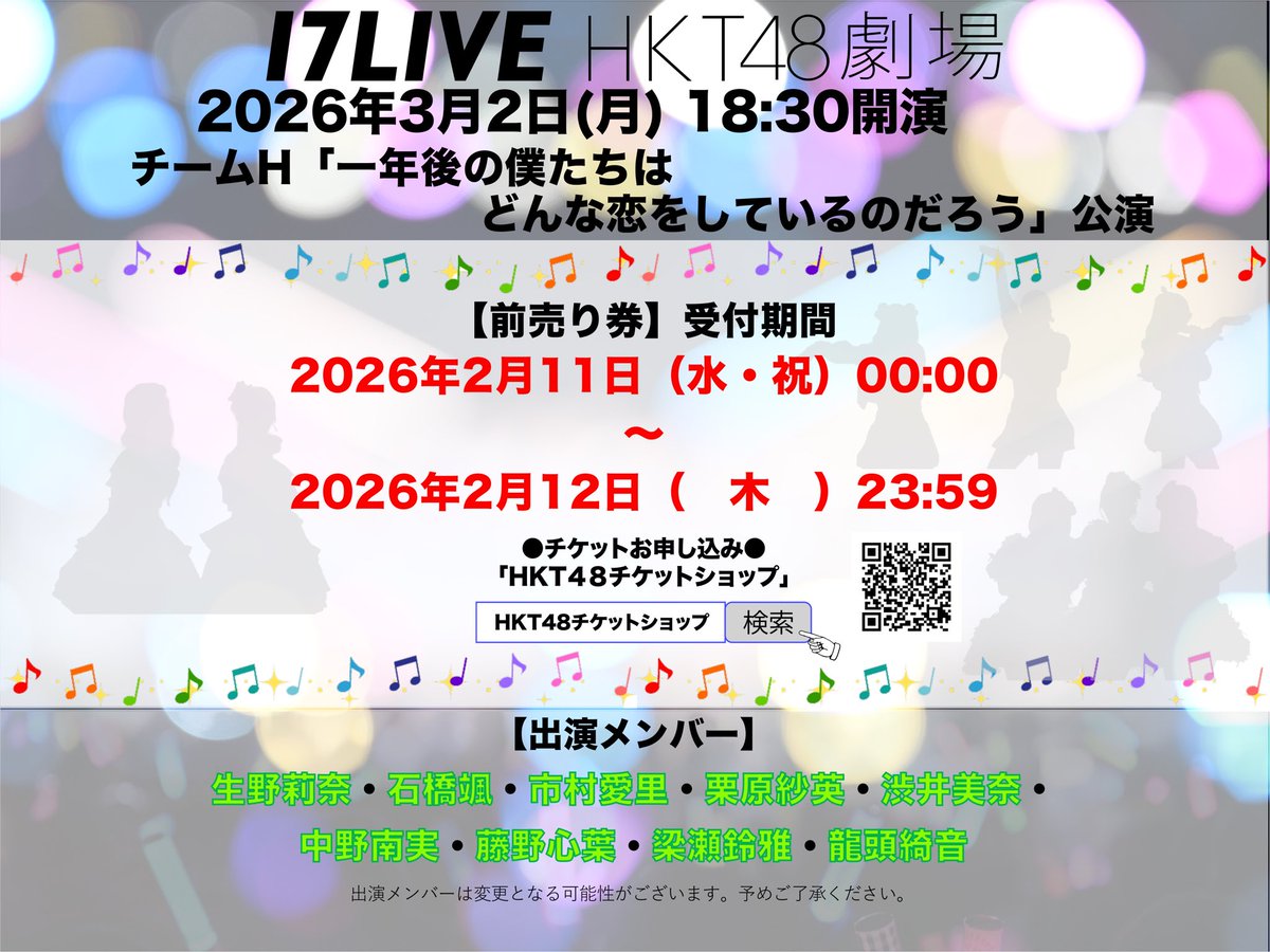 HKT48劇場 3月2日(月)の出演メンバーのお知らせ