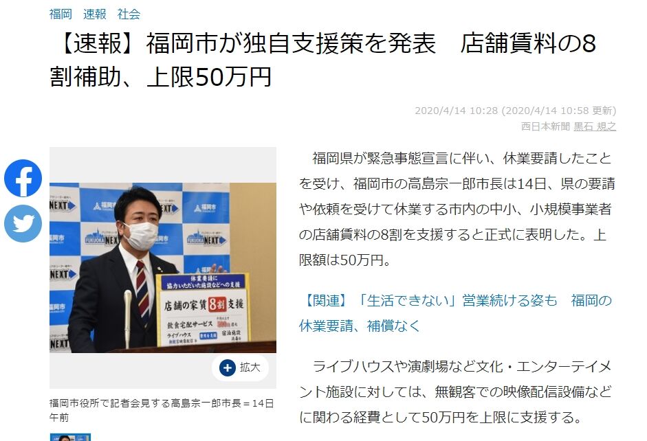 【ニュース】福岡市が独自支援策を発表、無観客での映像配信設備などに関わる経費として50万円を上限に支援
