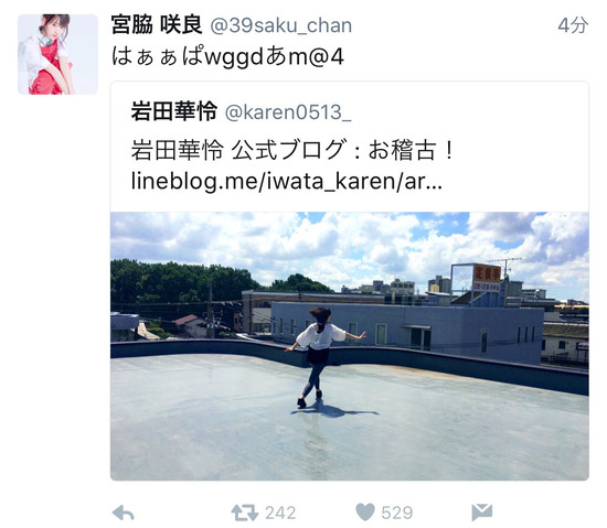 AKB48卒業生の岩田華怜(いわた・かれん)のブログ更新ツイートを引用し、「はぁぁぱwggdあm@4」と発信した画面がこちら。